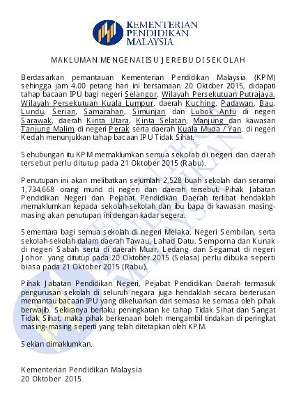 Oleh kerana jerebu, sekolah akan ditutup pada 21/10/2015. Peperiksaan yang dijadualkan pada 21/10/2015 akan ditunda ke 28/10/2015. Terima kasih.