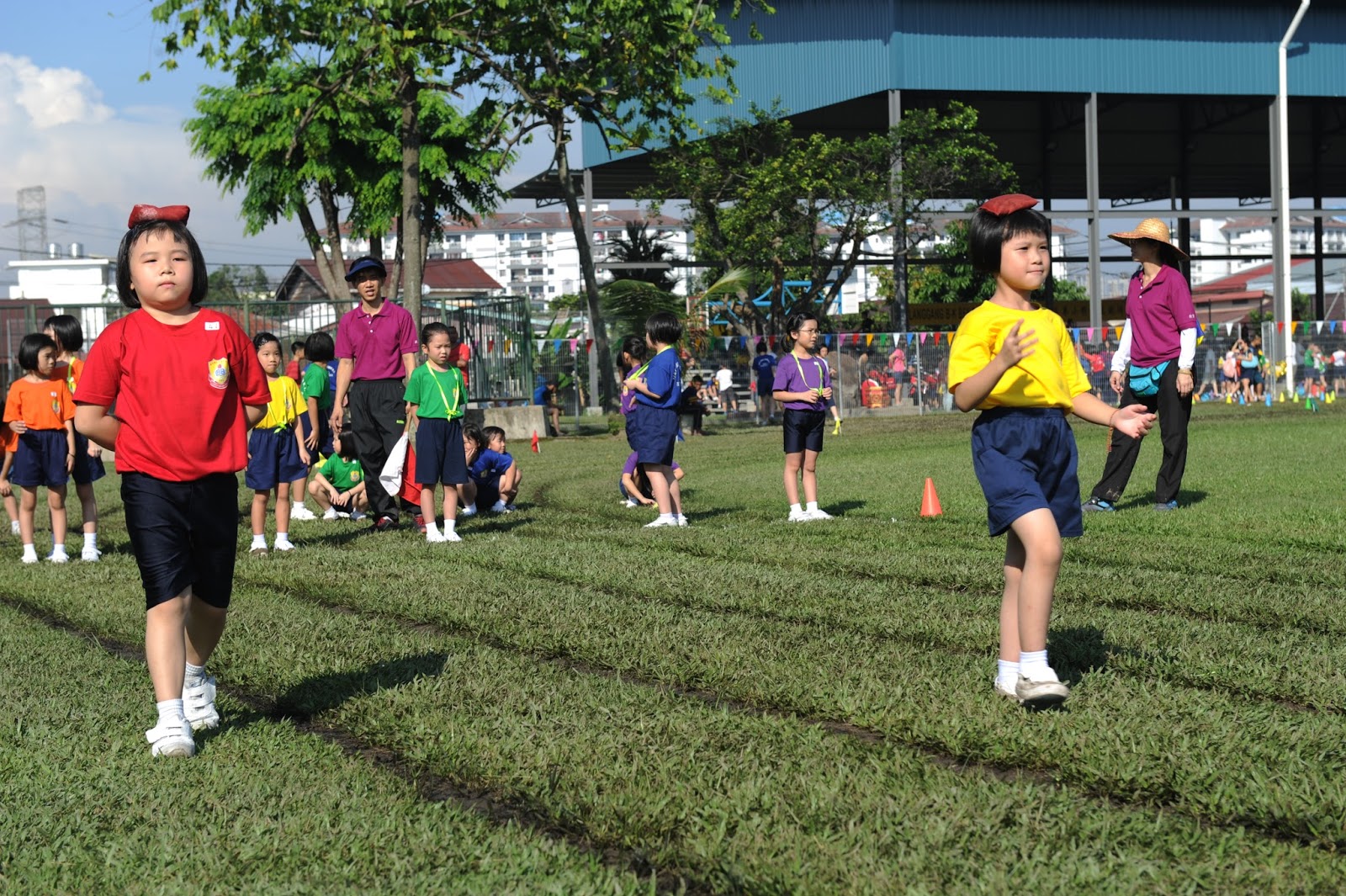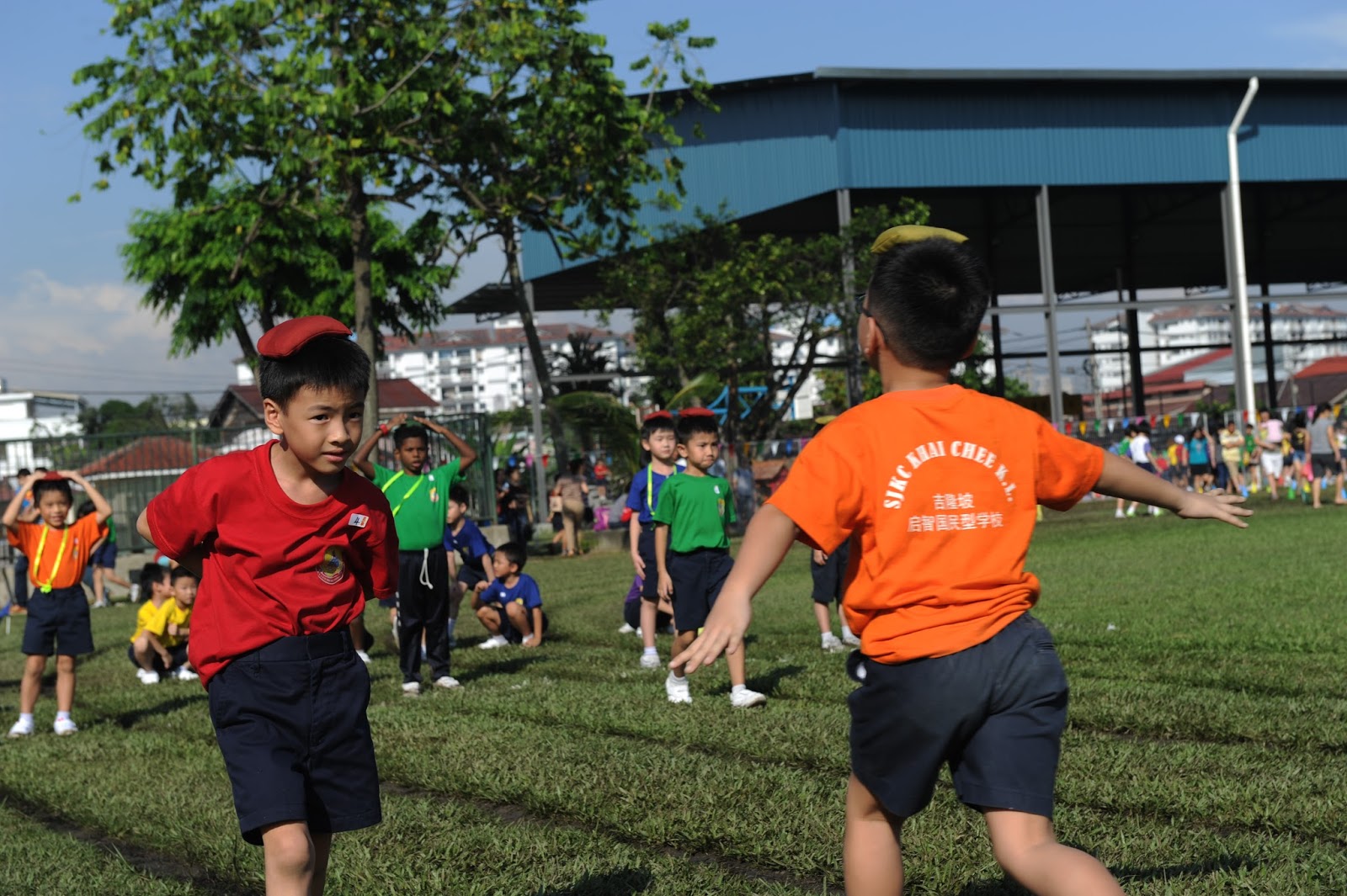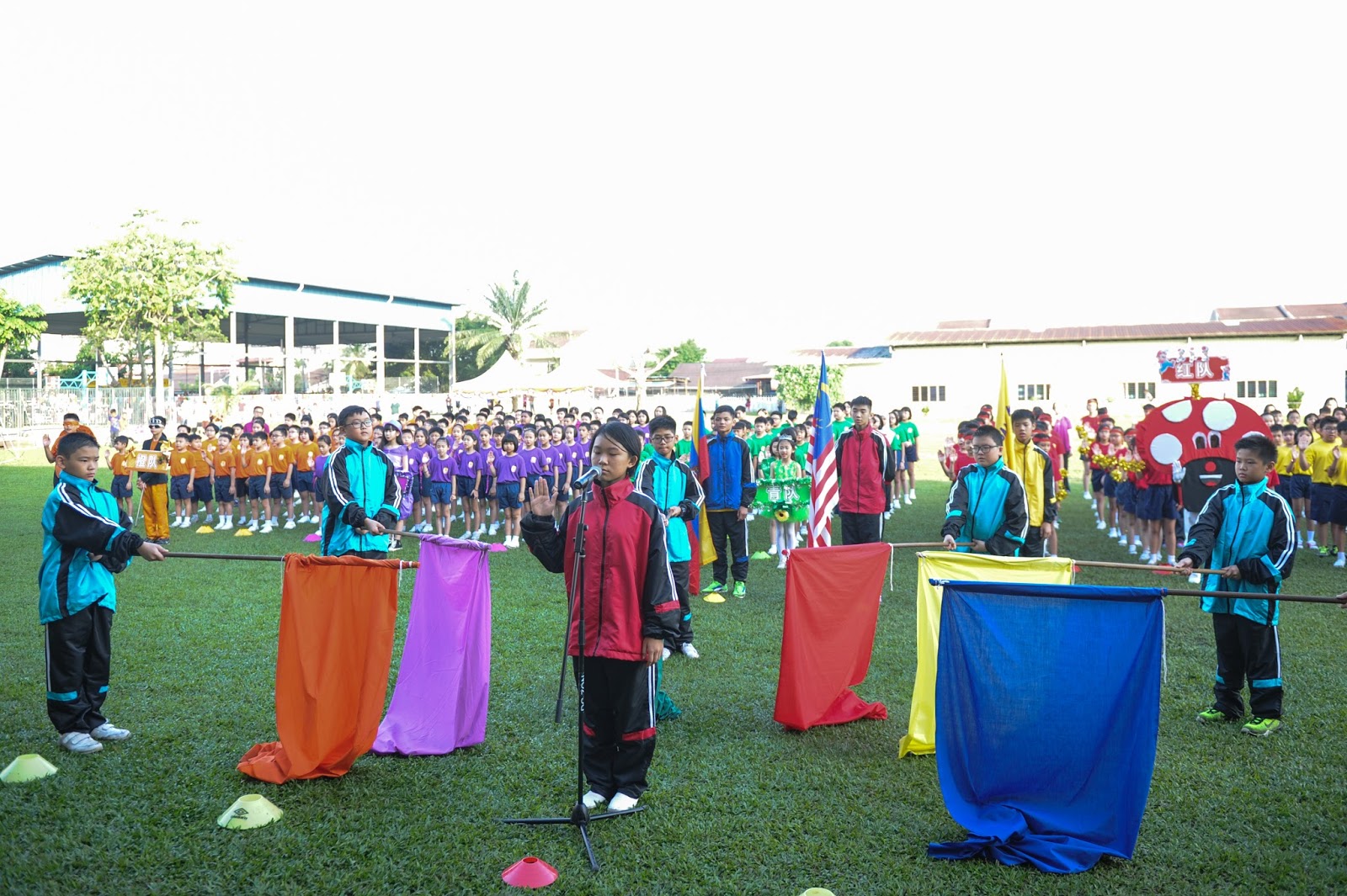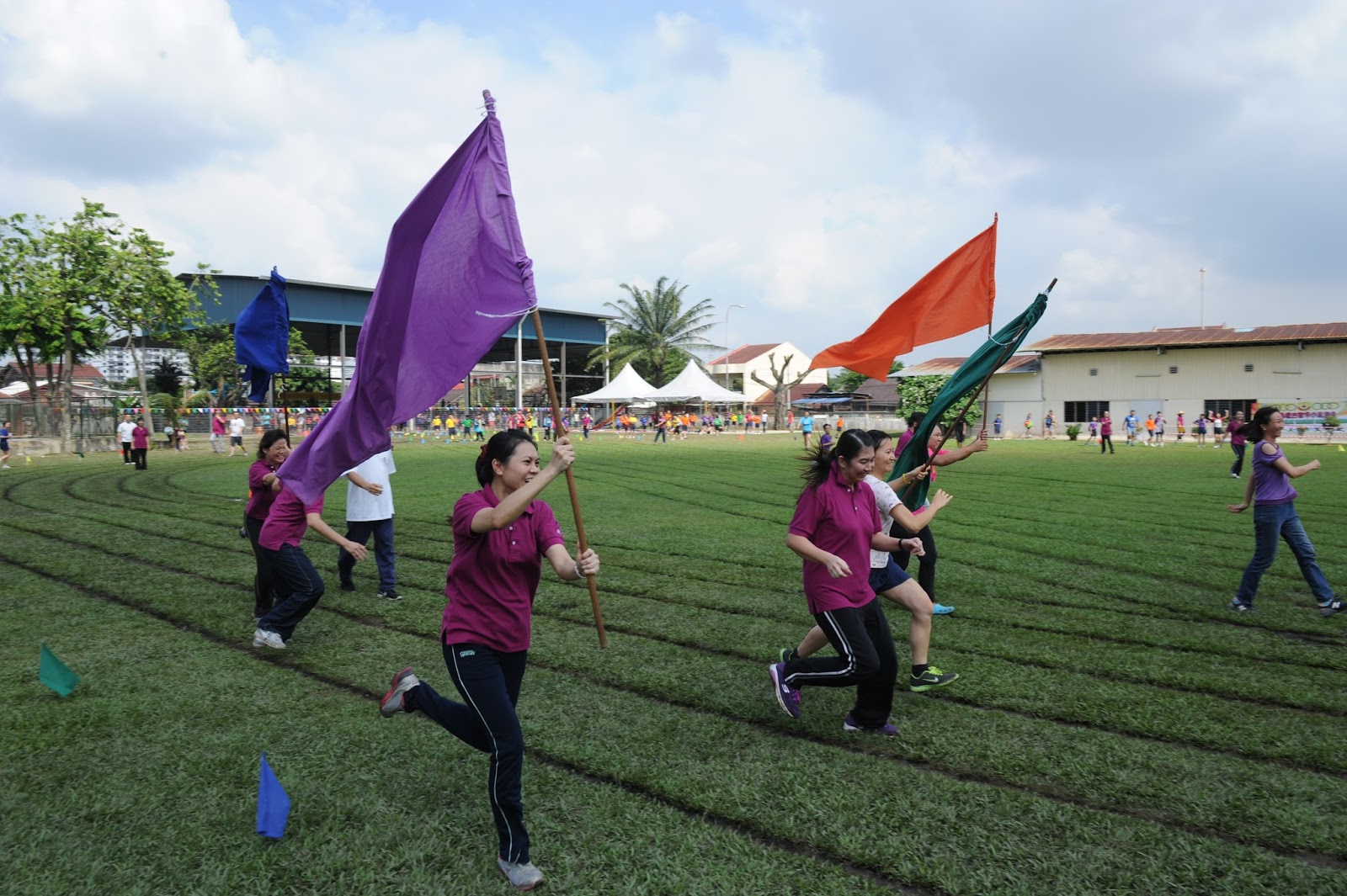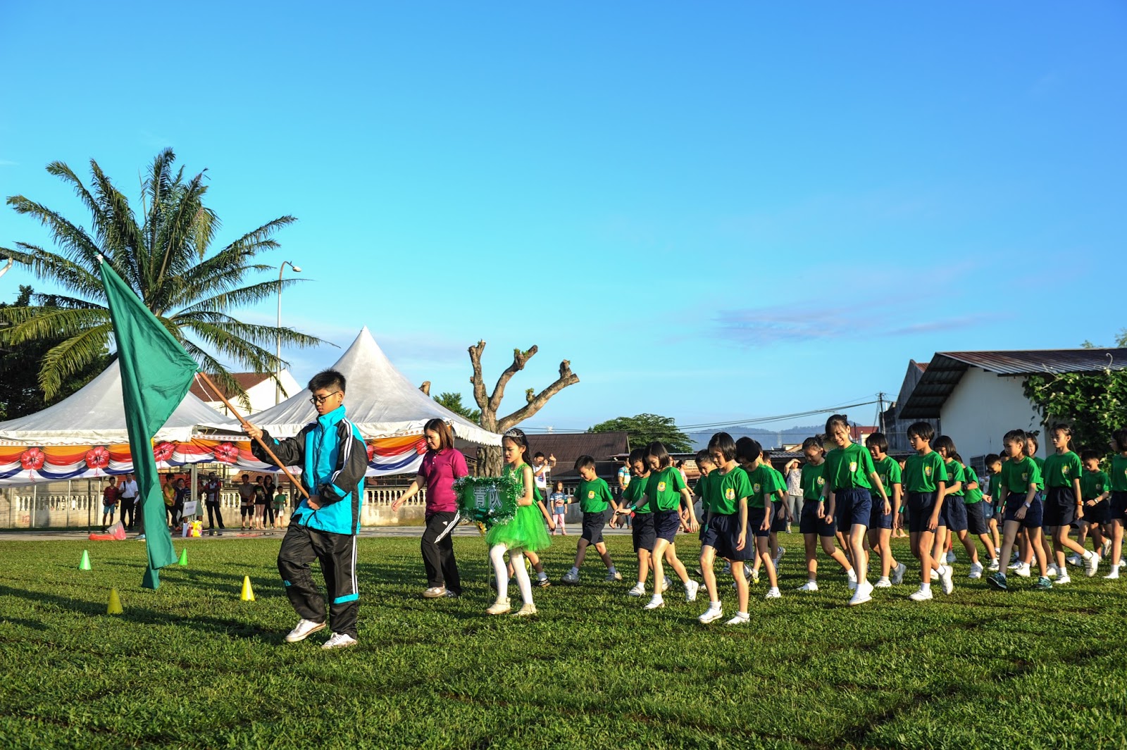 一大清早,全校师生都来到了运动场,他们有的布置场地 ,有的整理服装,有的安放运动器材,大家忙得不亦乐乎,原本寂静的赛场一下子热闹起来。