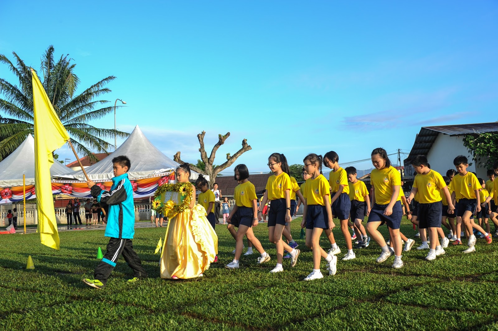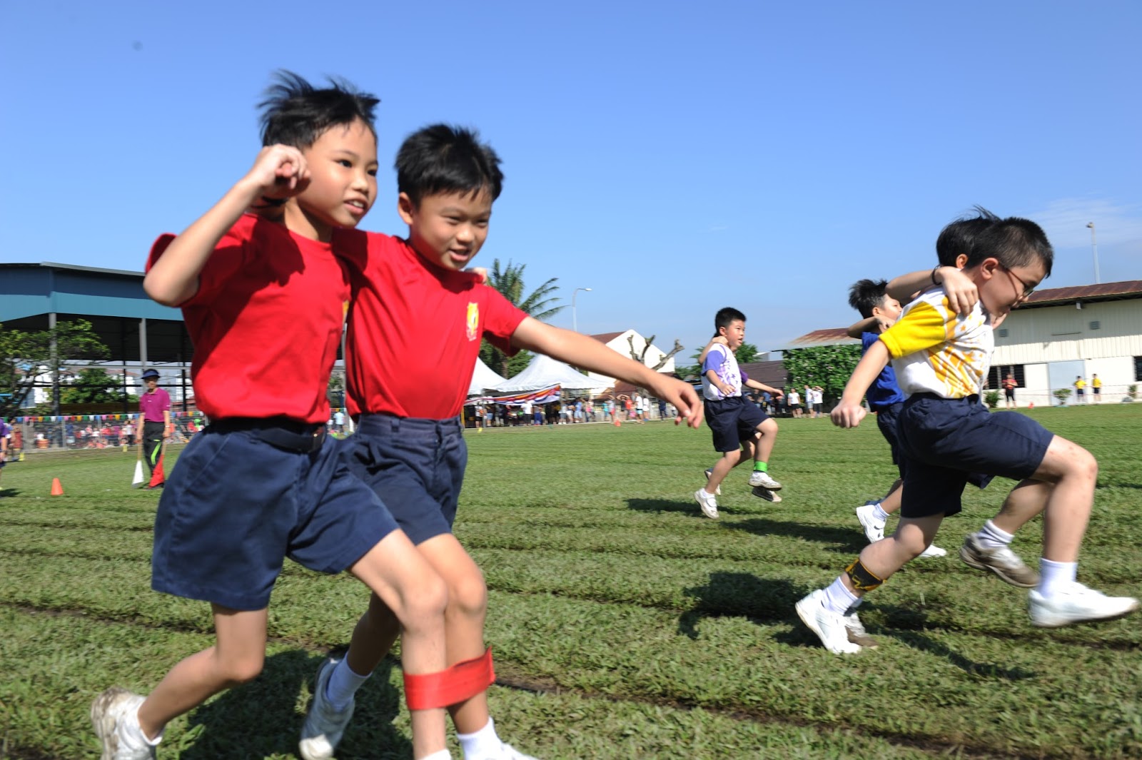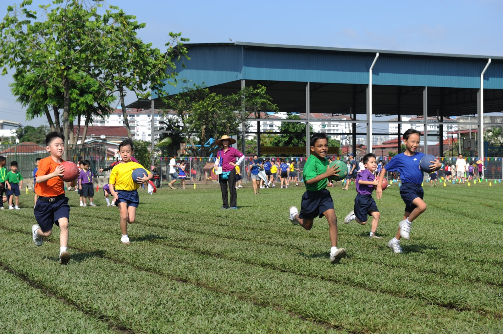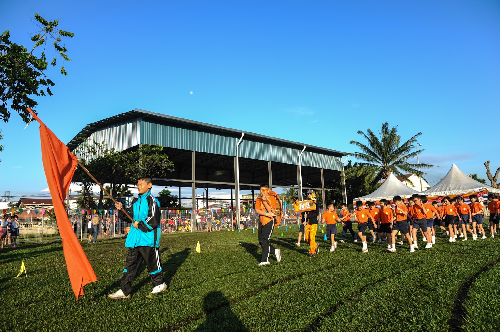 一大清早,全校师生都来到了运动场,他们有的布置场地 ,有的整理服装,有的安放运动器材,大家忙得不亦乐乎,原本寂静的赛场一下子热闹起来。