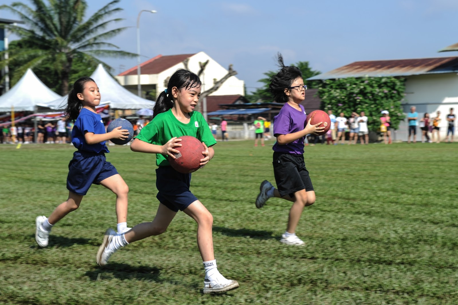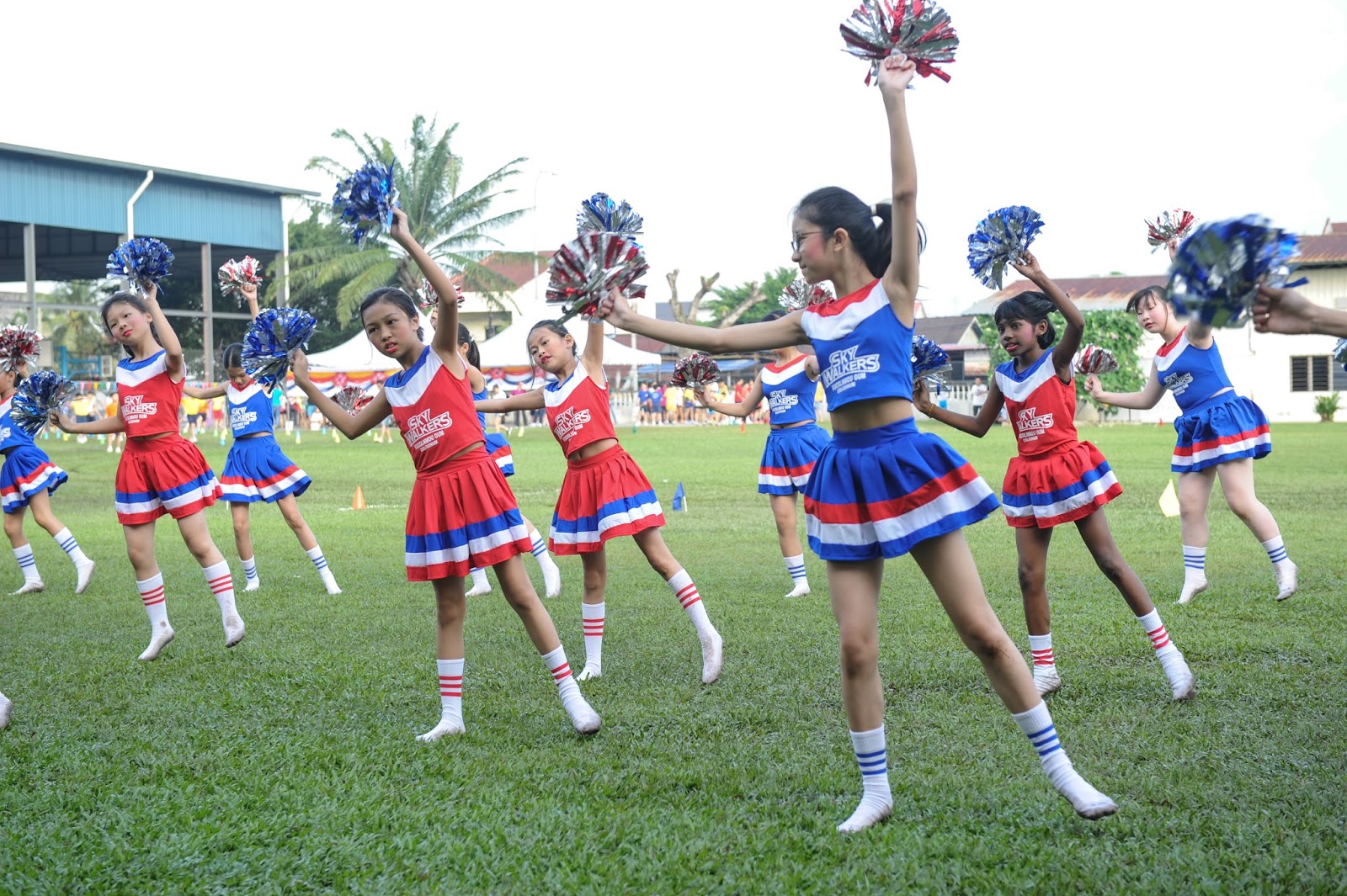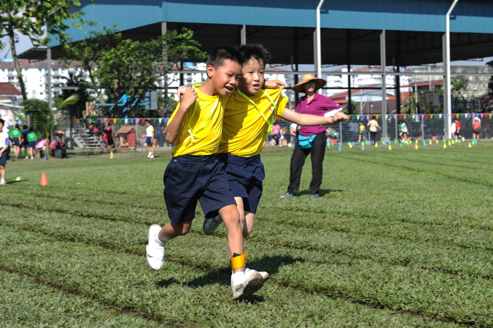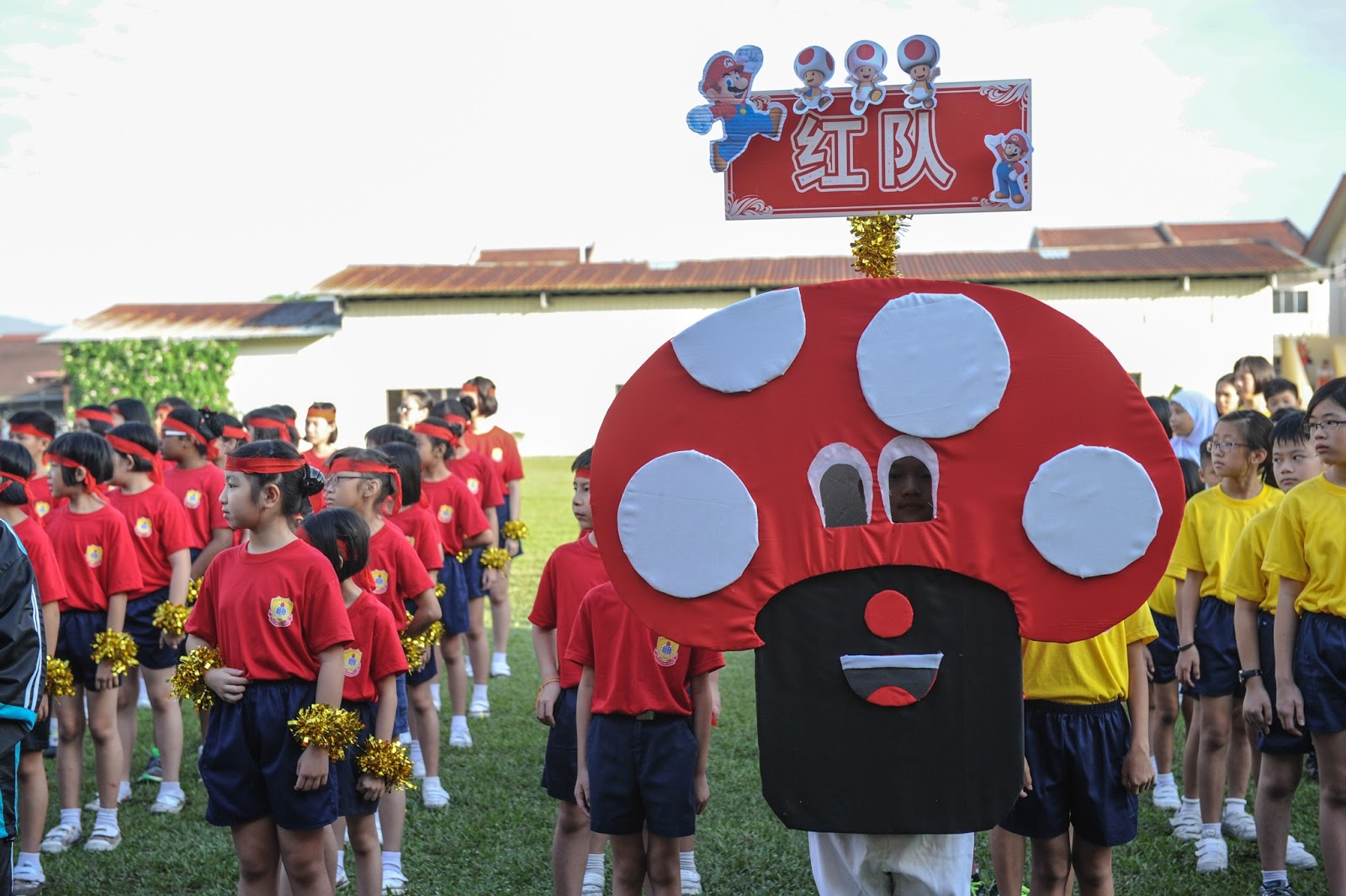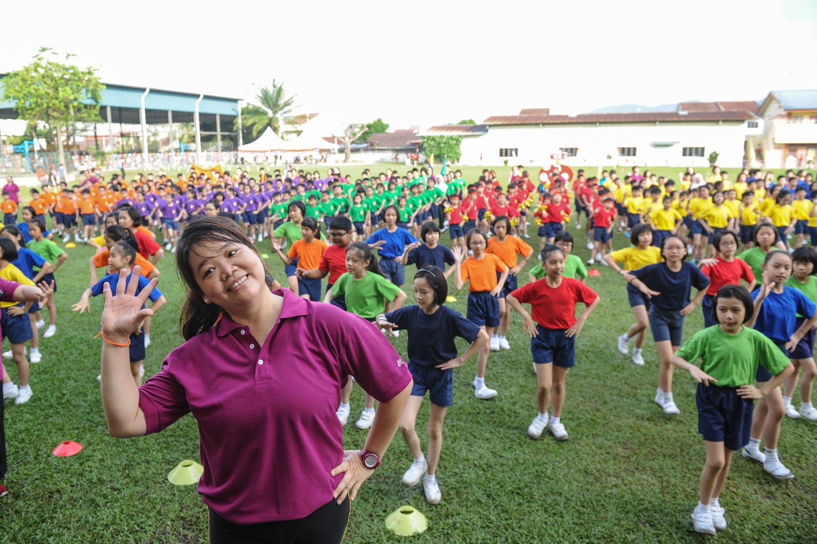 一大清早,全校师生都来到了运动场,他们有的布置场地 ,有的整理服装,有的安放运动器材,大家忙得不亦乐乎,原本寂静的赛场一下子热闹起来。