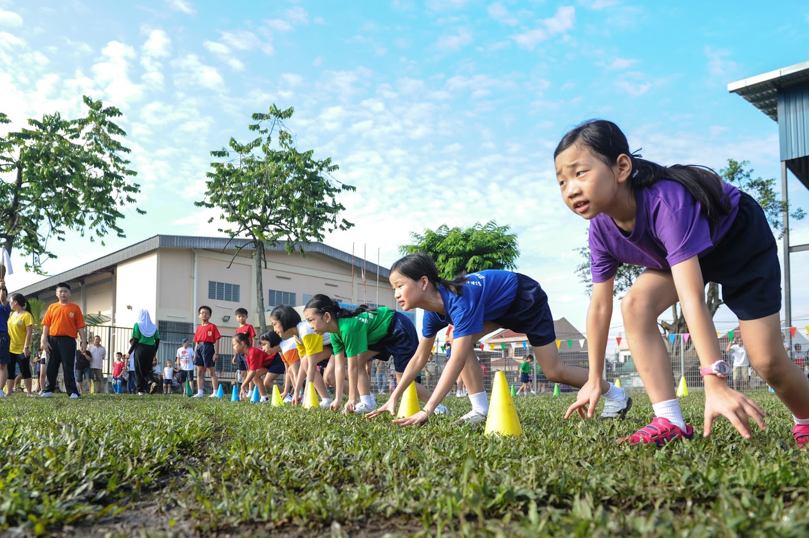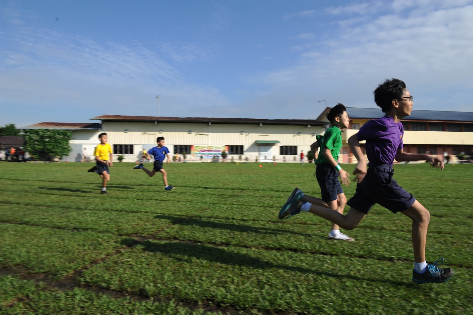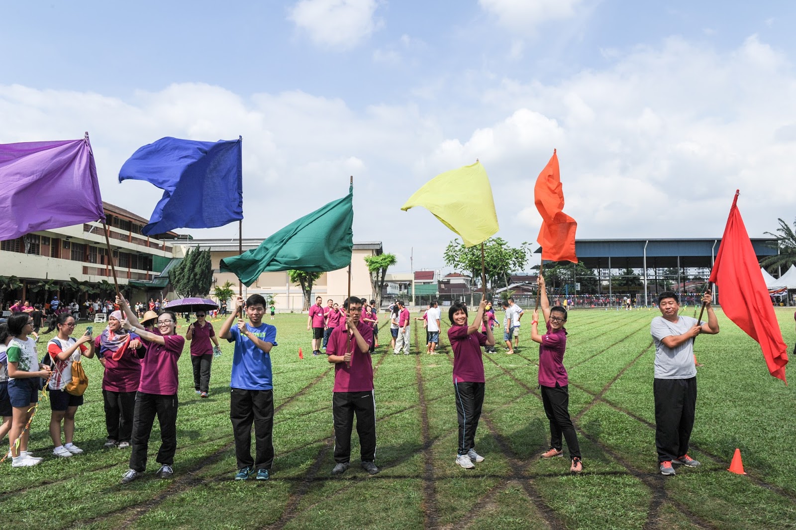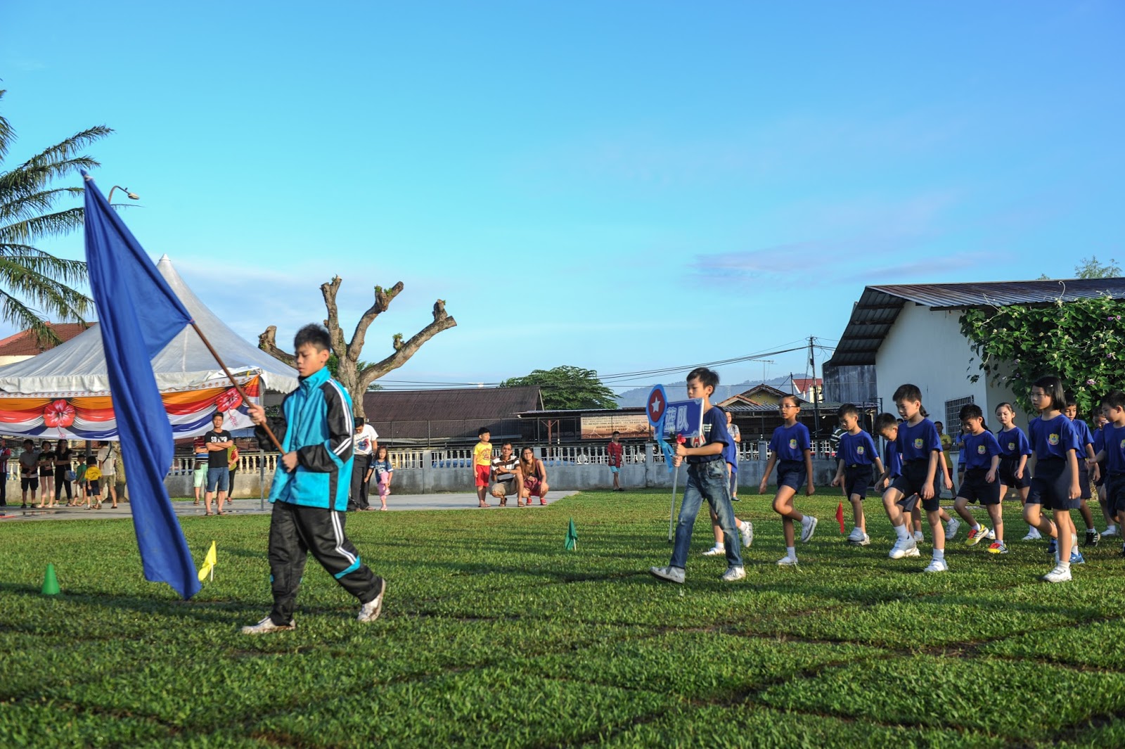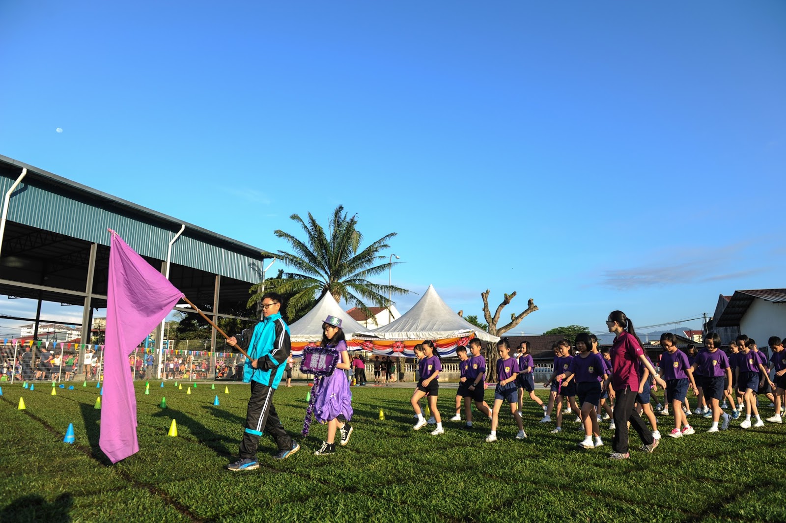 一大清早,全校师生都来到了运动场,他们有的布置场地 ,有的整理服装,有的安放运动器材,大家忙得不亦乐乎,原本寂静的赛场一下子热闹起来。