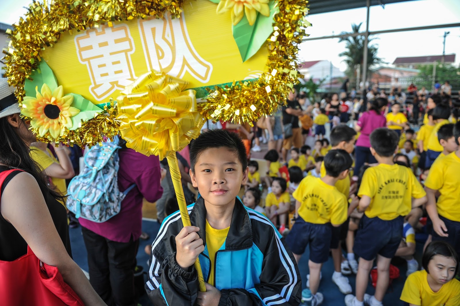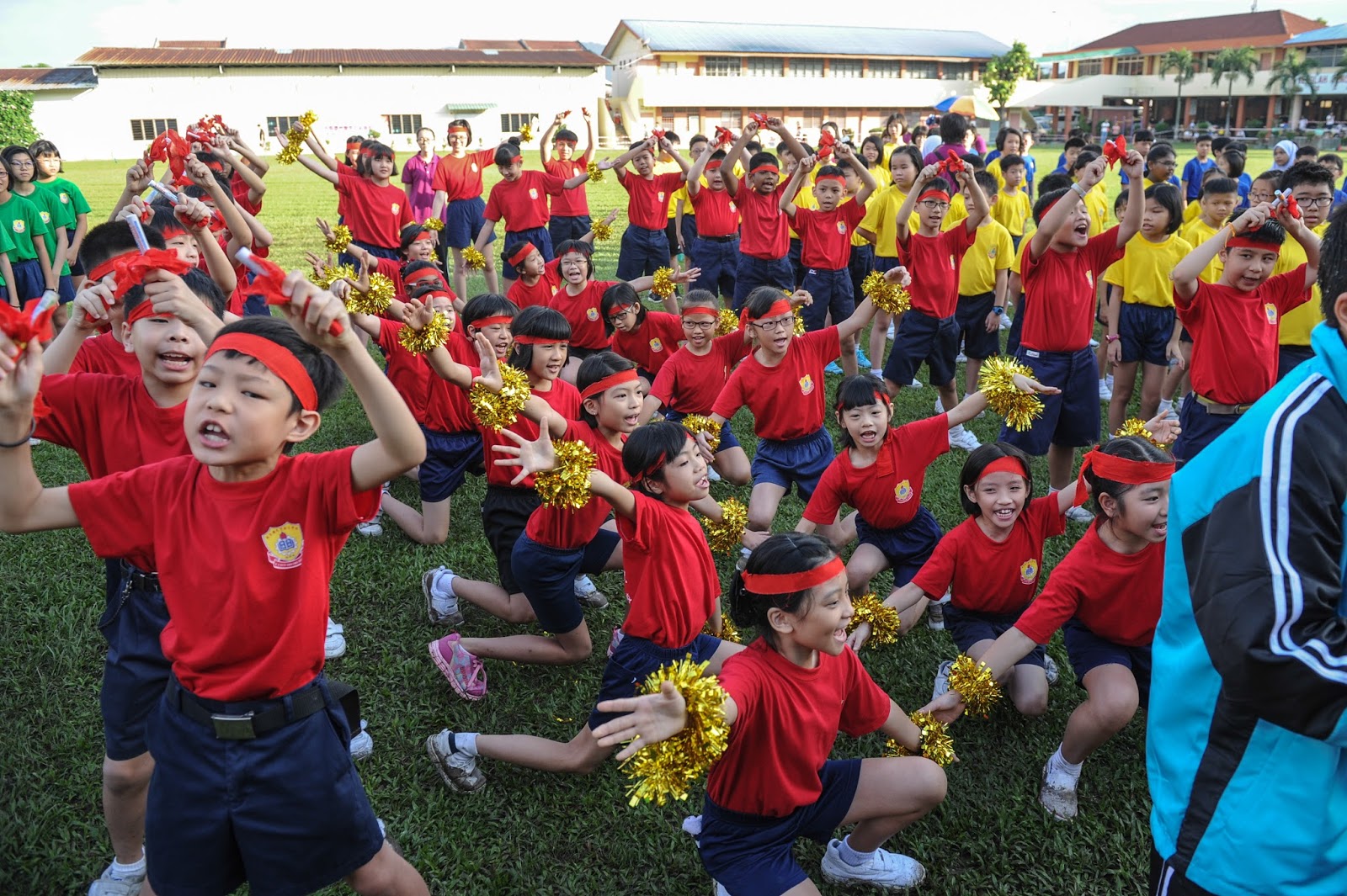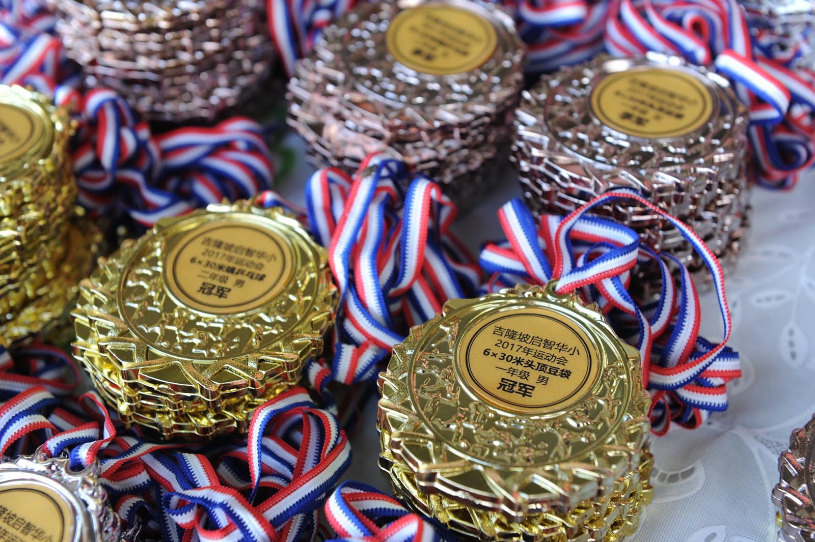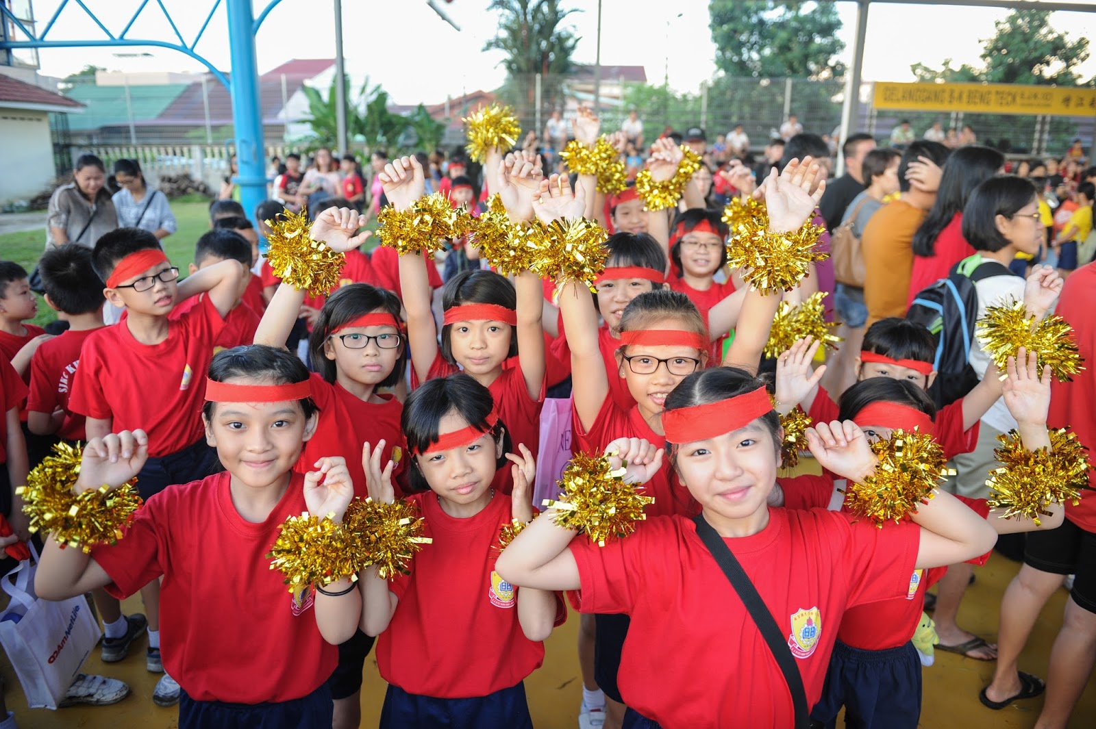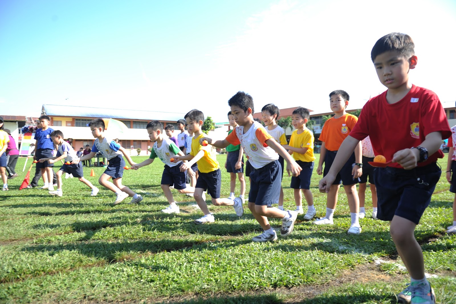 一大清早,全校师生都来到了运动场,他们有的布置场地 ,有的整理服装,有的安放运动器材,大家忙得不亦乐乎,原本寂静的赛场一下子热闹起来。