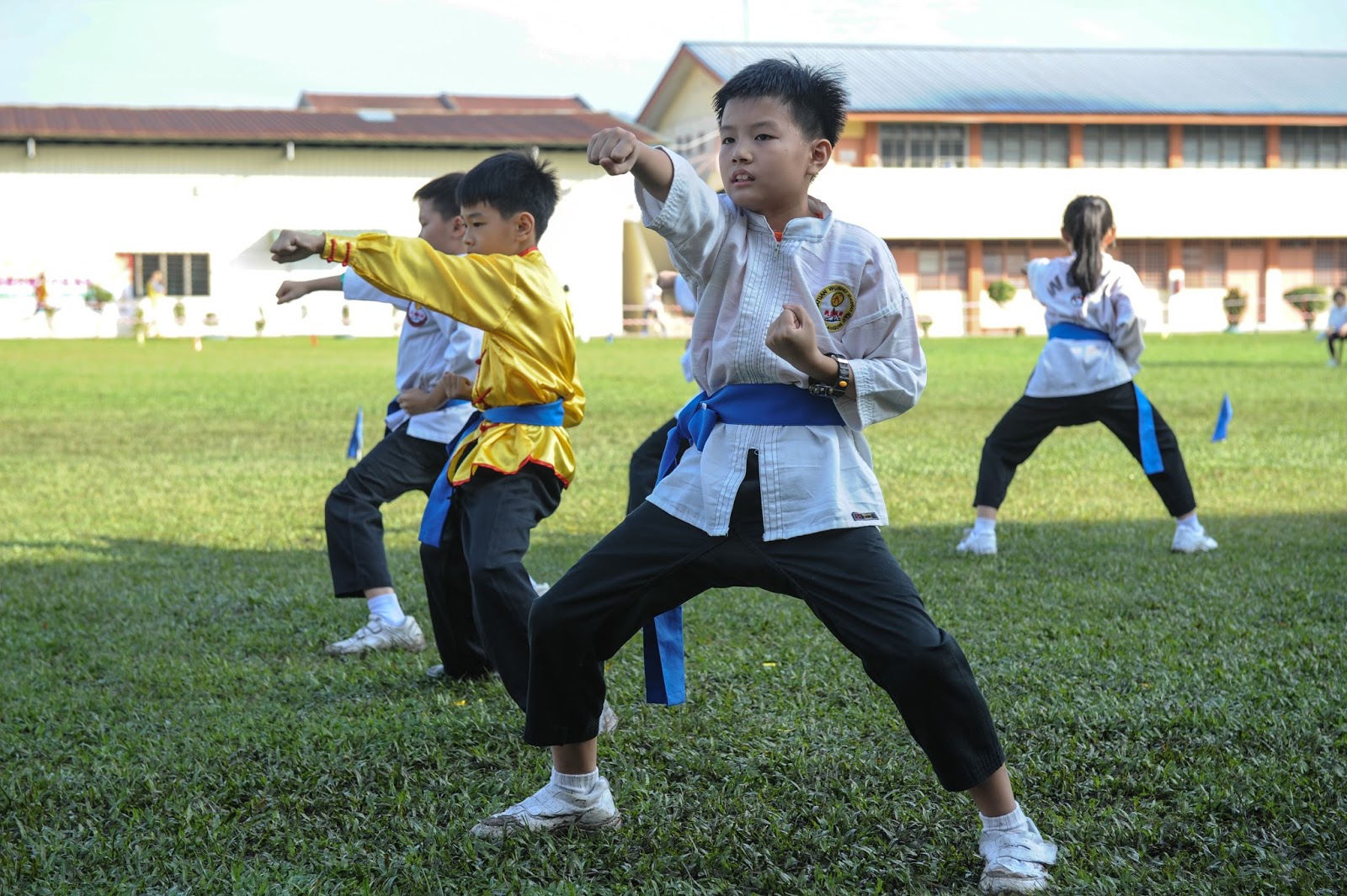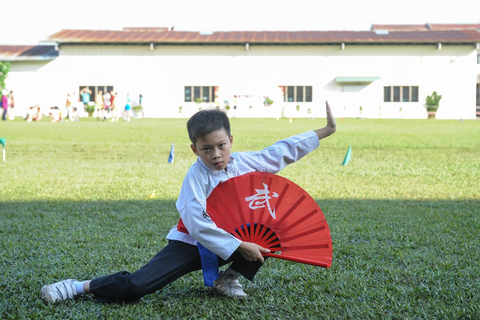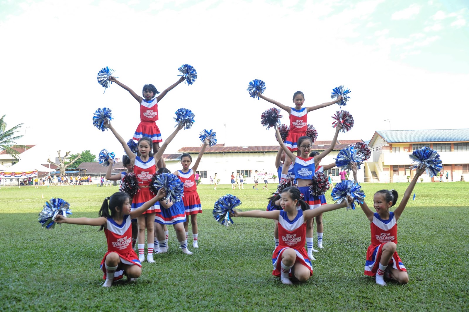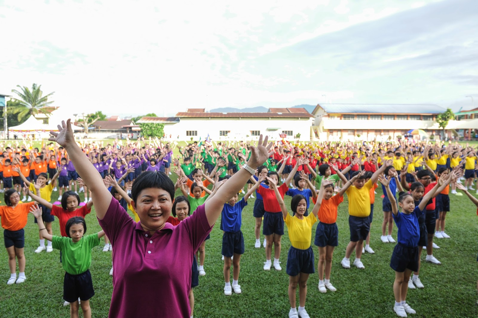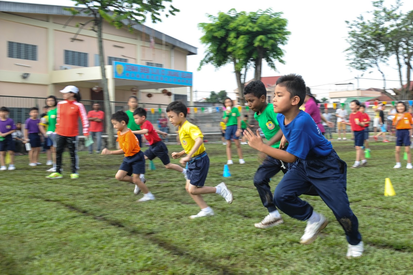 一大清早,全校师生都来到了运动场,他们有的布置场地 ,有的整理服装,有的安放运动器材,大家忙得不亦乐乎,原本寂静的赛场一下子热闹起来。