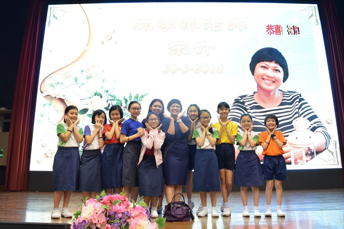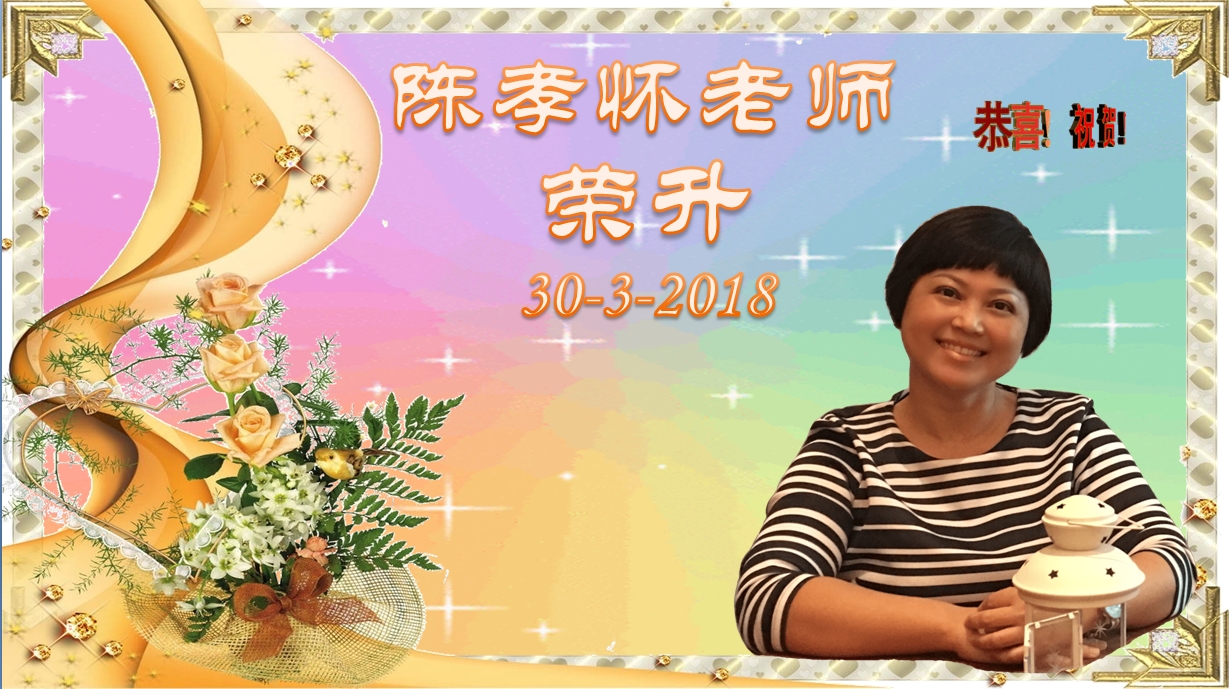 陈孝怀老师接获教育局的委任信正式升级为增江中区一小课外活动(兼修课程)副校长 。我们都为她感到开心,这是她多年来为教育界所付出的努力。陈老师的离开对本校是 一大损失,但天下无不散筵席,我们会永远记得与感恩陈老师多年来为学校默默耕耘,将自己的青春奉献给启智华小。