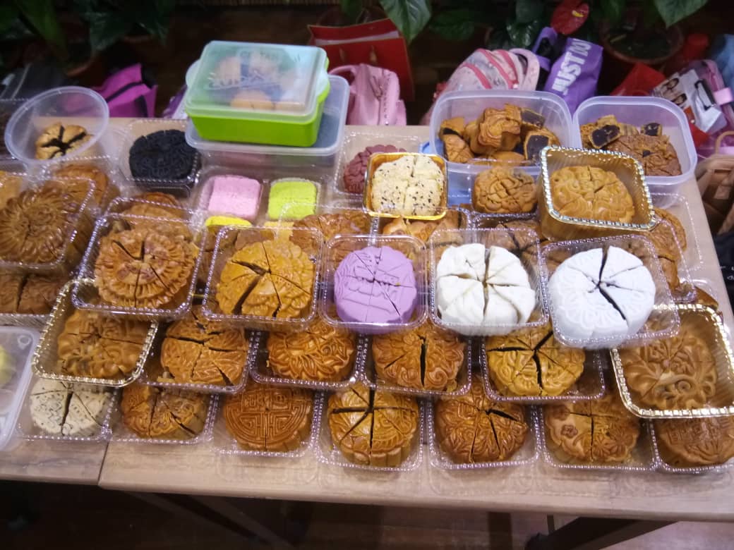 同一时间,老师们把学生们带来的月饼平均切块,