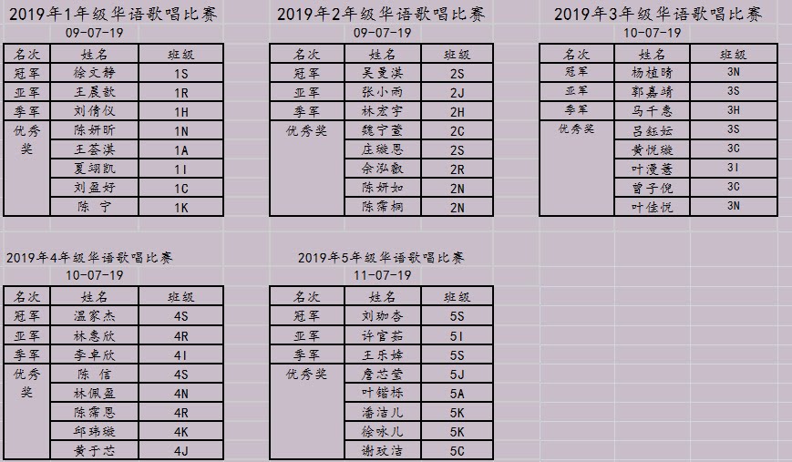五年级参赛者和得奖者